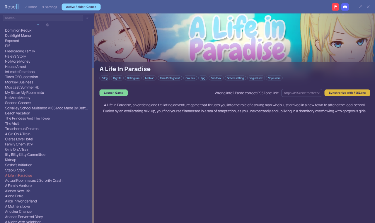 Rose[] scans your games folder, automatically identifies each game, and pulls metadata from F95Zone — cover art, description, tags, version info, and release date. Everything is displayed in a clean interface so your collection finally looks like a proper library.